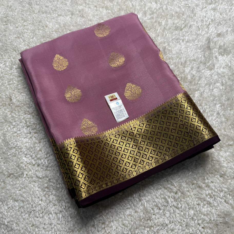 Experience the elegance of traditional craftsmanship with this exquisite Pure Mysore Silk Saree, beautifully adorned with rich zari buttas that enhance its timeless appeal. The saree features an intricately woven contrast zari border, crafted with detailed geometric patterns that add a luxurious and refined finish.