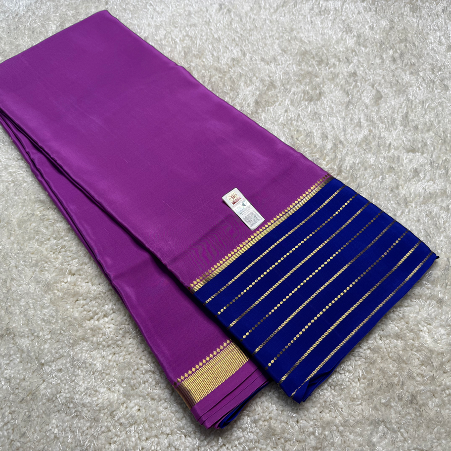 This exquisite 100 GSM Pure Mysore Silk Saree blends traditional craftsmanship with a modern, graceful finish. Designed with a unique one-side contrast border, the saree stands out for its refined aesthetics and minimalist elegance. The highlight is the beautifully woven lines-style pallu, featuring zari detailing that adds sophistication and visual charm.