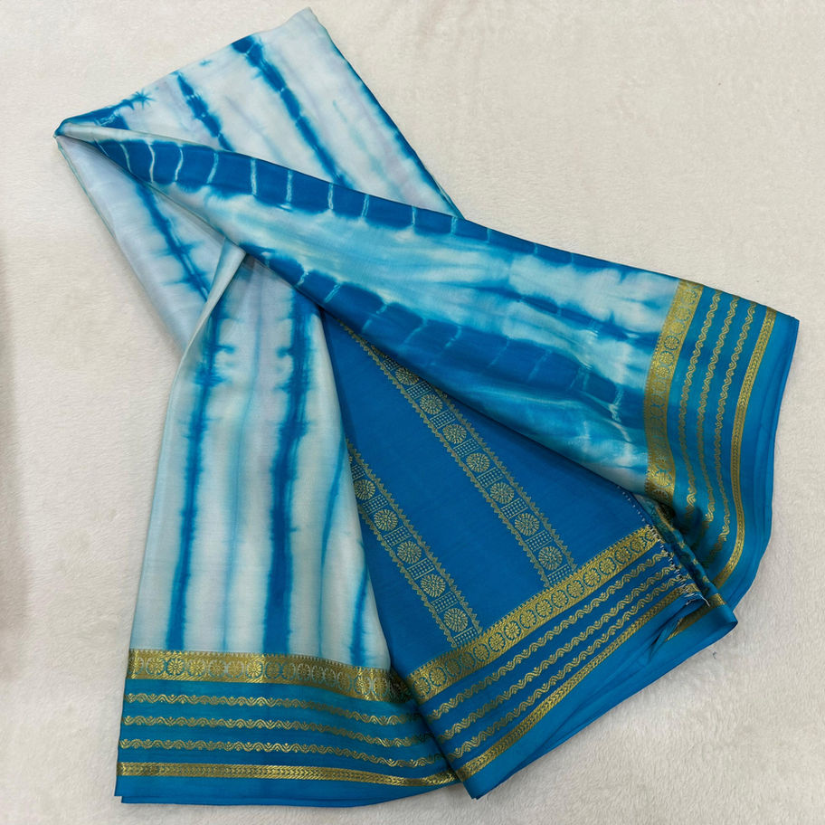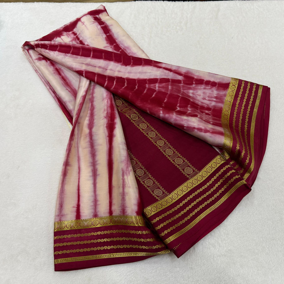 Experience the perfect blend of modern artistry and classic tradition with our Marble Print Pure Mysore Silk Saree. Crafted from the finest pure Mysore silk, this saree features a unique and eye-catching marble or tie-dye print that gives it a distinct, contemporary look. The fluid and artistic patterns are beautifully contrasted by a traditional, rich gold zari border, creating a harmonious blend of old and new.