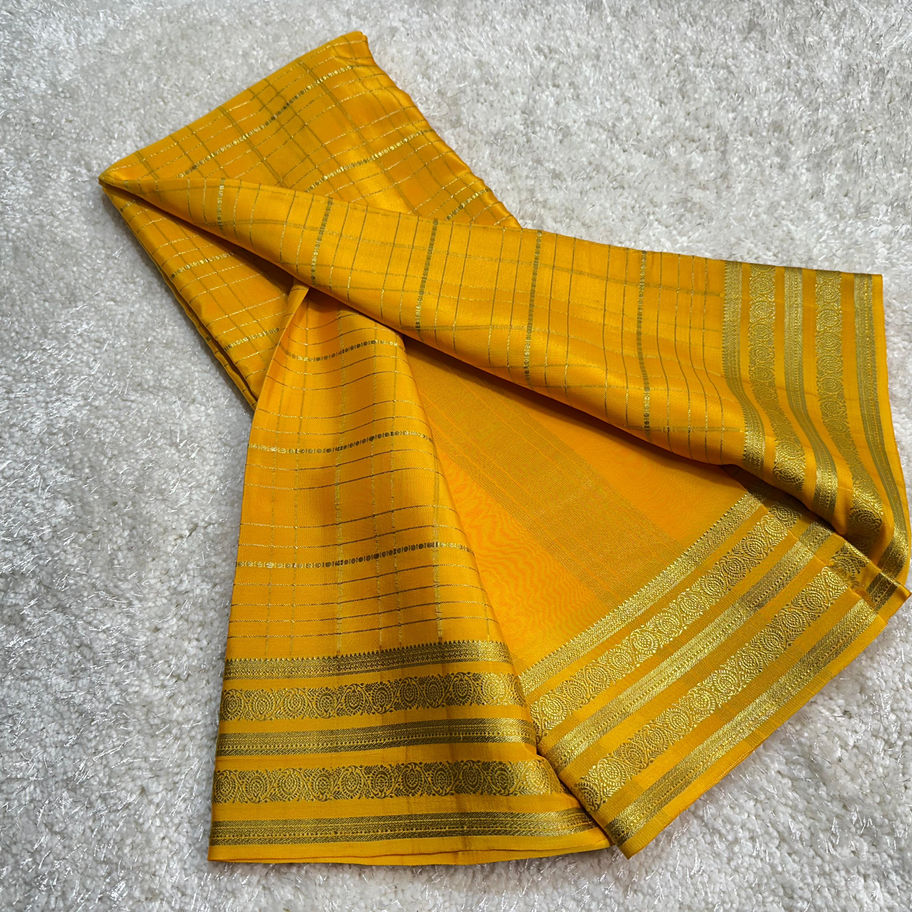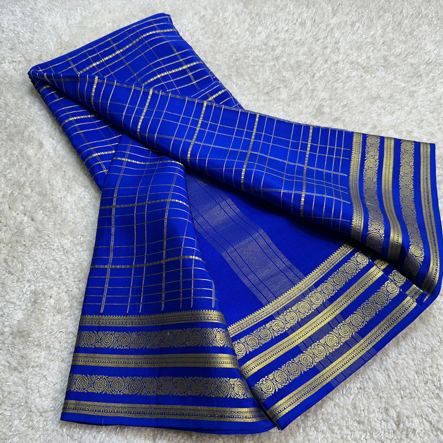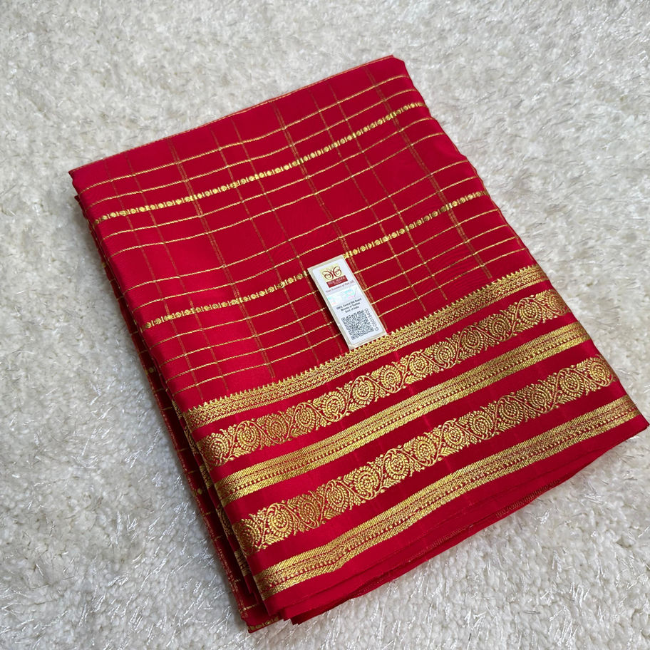 The saree's pure design focuses on the beauty of its rich, solid colour and the intricate zari border. This beautiful border is designed with traditional lines and patterns, perfectly complementing the checkered body without the use of motifs. This simplicity makes it a versatile and elegant choice for any special occasion.