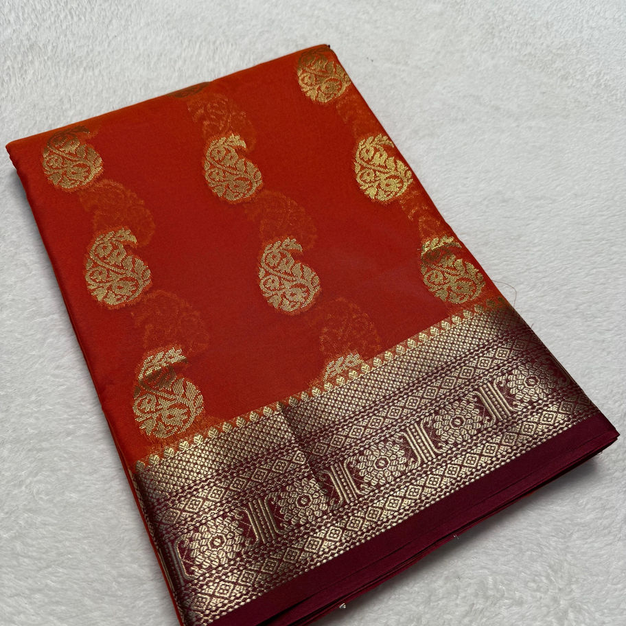 Radiant Orange & Deep Maroon Semi-Crepe Mysore Silk Saree with Vertical Paisley
