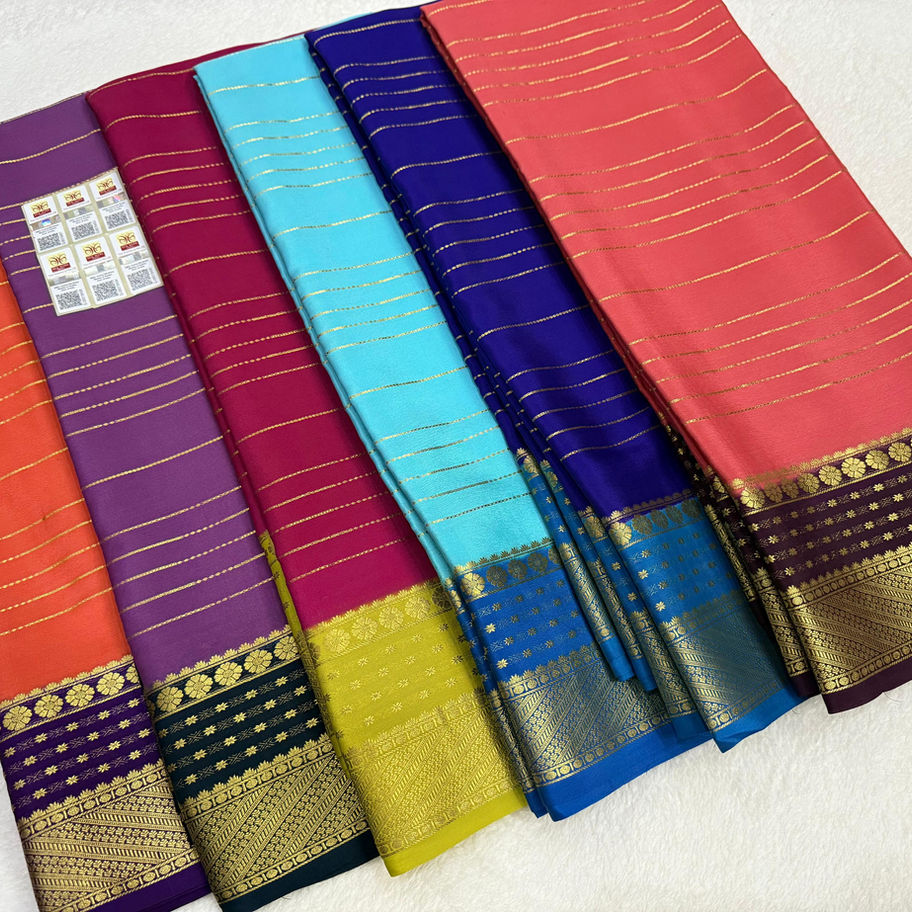 Step into a world of pure luxury with our Pure Mysore Silk Sarees. Known for their unparalleled softness and rich sheen, these sarees drape effortlessly, making you feel both regal and comfortable. The main body of each saree is adorned with subtle yet striking gold zari lines, adding a touch of sophistication. The standout feature is the broad, contrasting zari border, featuring a classic temple design and intricate patterns that beautifully frame the saree. Available in a palette of vibrant hues—from radiant magenta to deep royal blue—this collection is an essential for any connoisseur of traditional handlooms.